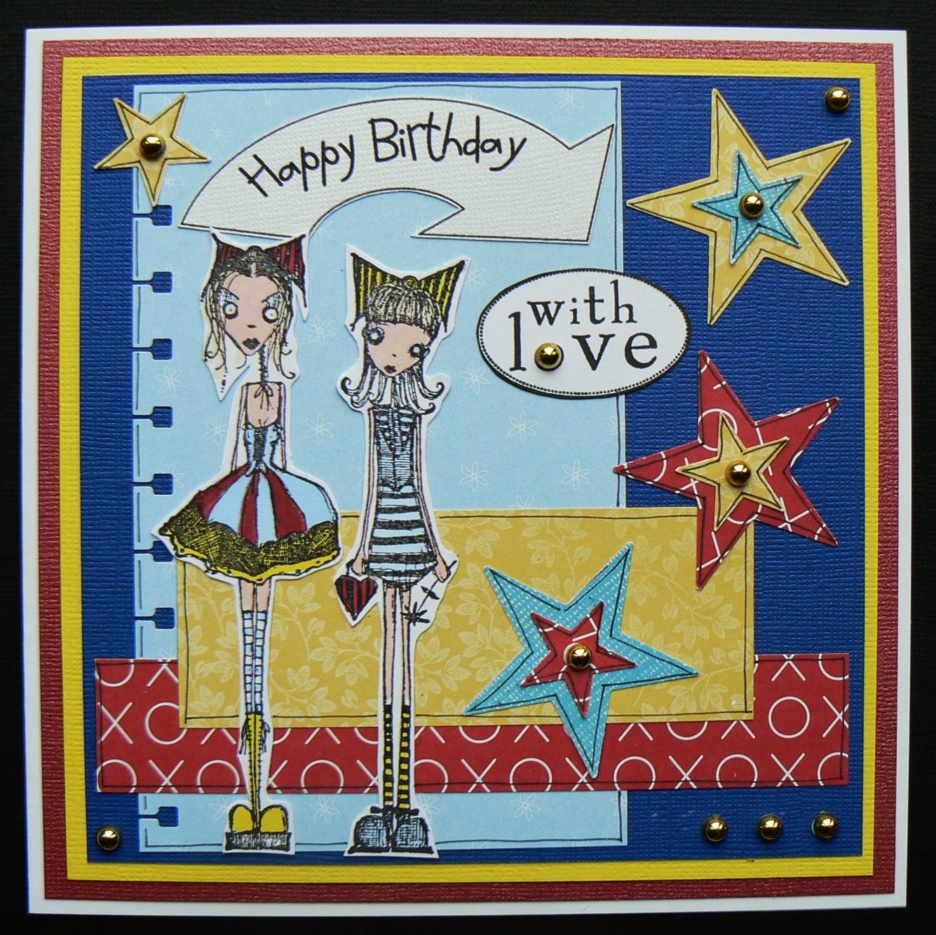 I've made this card for this week's Dare over at Daring Cardmakers. The theme is Back to Basics and we have to use the 3 primary colours Blue, Yellow and Red - not the easiest of combinations but I'm pretty pleased with my attempt and I really love using these quirky character stamps from Stampotique.